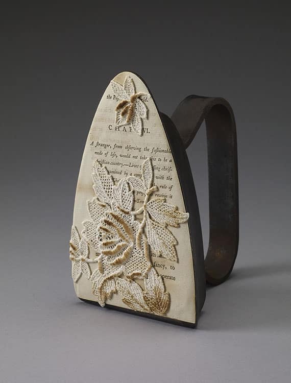 antique sad iron, scorched lace and paper: pages by Hannah More, 1791