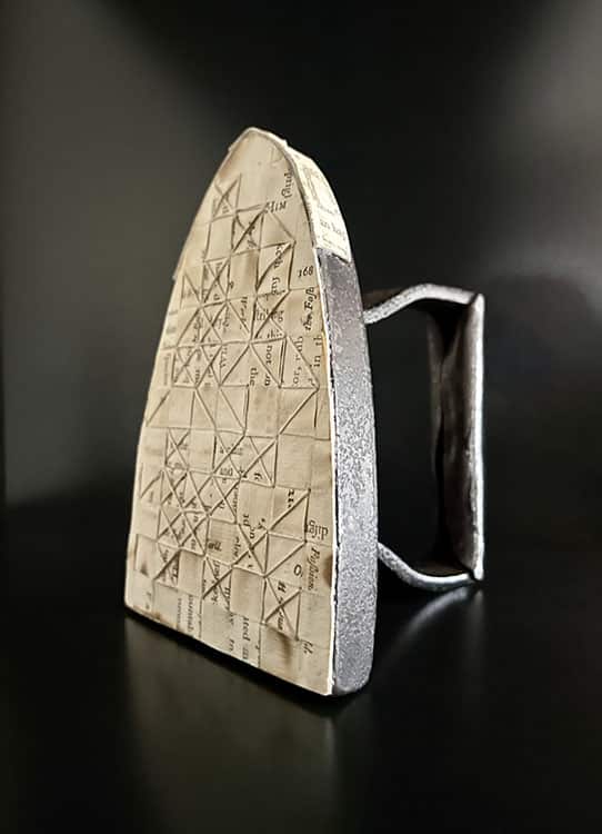 antique sad iron, scorched linen thread and paper: pages by Hannah More, 1791